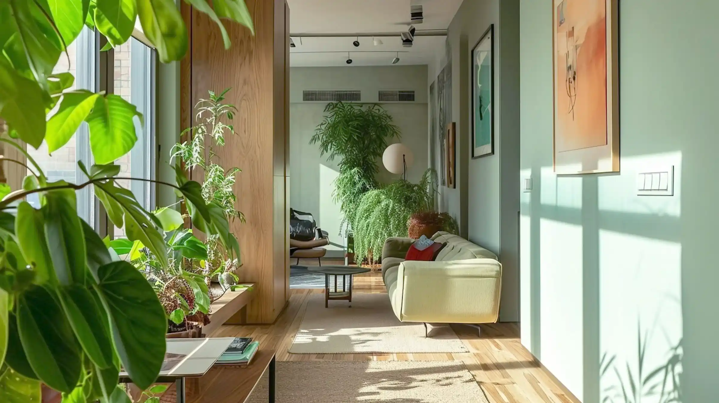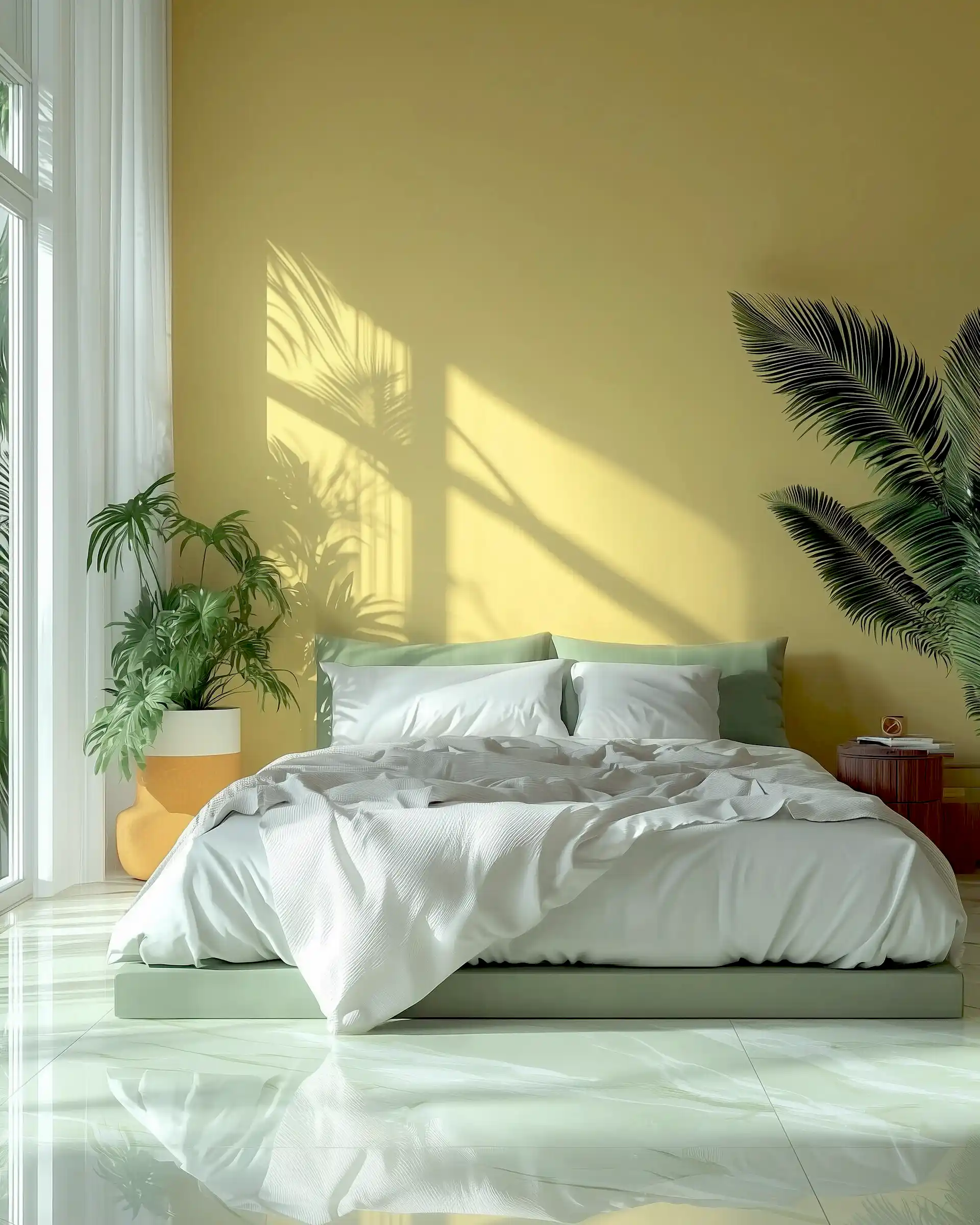 A serene bedroom featuring a harmonious color palette of soft greens and a warm yellow. Natural light streams in from a large window on the left, casting intriguing palm tree shadows across the vibrant yellow wall.